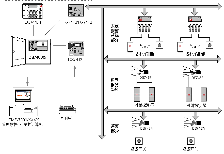 BOSCH的住宅小區(qū)聯(lián)網(wǎng)報警系統(tǒng)主要是將DS-3MX / DS6MX-CHI配合到DS7400Xi-CHI系統(tǒng)里,通過總線方式連接,可以構(gòu)成以下各種子系統(tǒng):